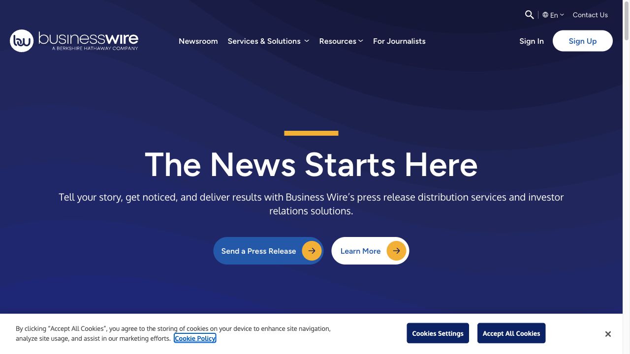 Business Wire is a premium wire service starting at ~$760 per national release, best for financial disclosures and investor relations announcements. Owned by Berkshire Hathaway, it is used by most Fortune 500 companies for earnings releases and SEC-compliant material disclosures.