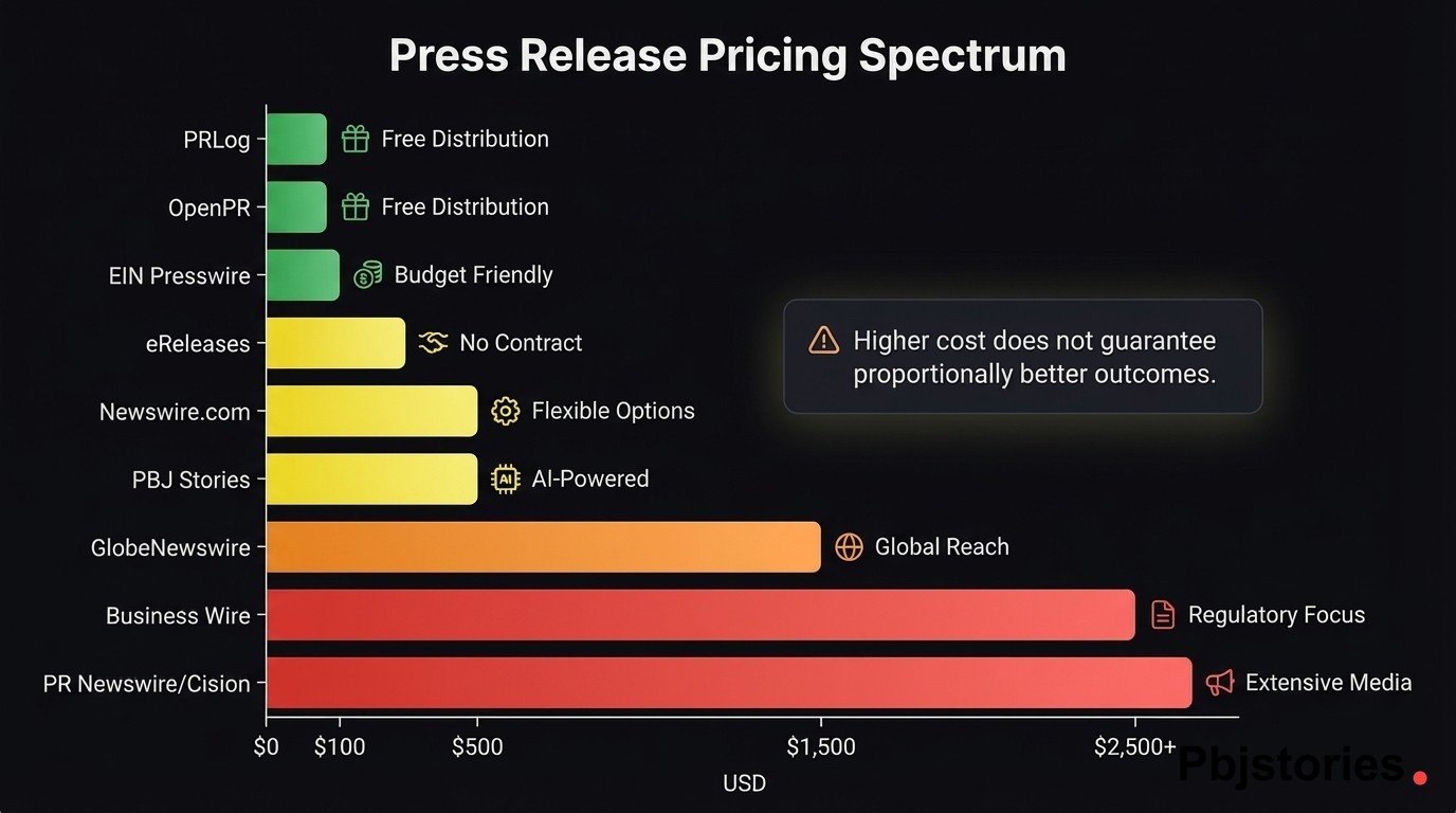 Pricing ranges from $0 on PRLog and OpenPR to $2,500+ per release on PR Newswire with full targeting and multimedia. Mid-range platforms like eReleases and EIN Presswire fall between $99 and $499 per release. Cost increases with add-ons such as geographic targeting, multimedia attachments, and extended word counts. Requesting a quote before committing is essential, since most vendors hide exact figures behind contact forms.