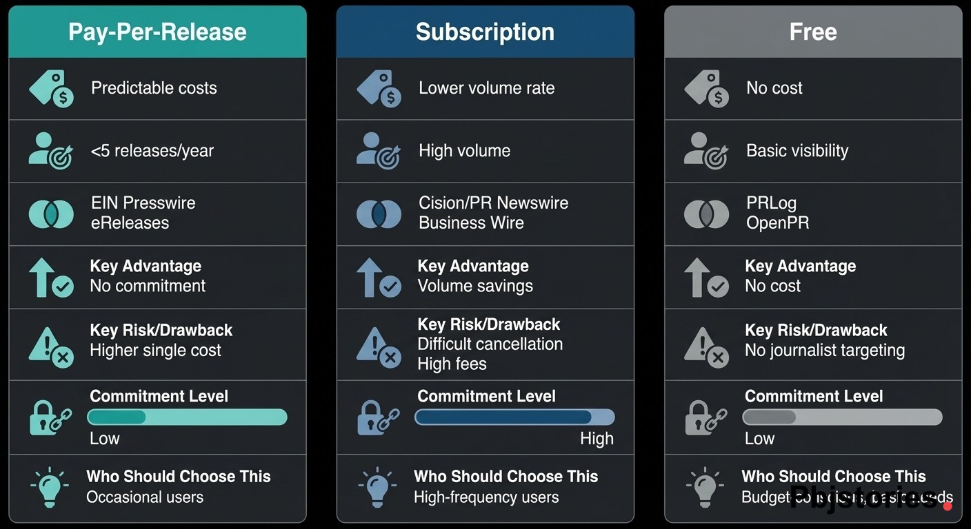 Three pricing structures dominate the press release distribution market: pay-per-release, subscription or annual contract, and free with limited features.