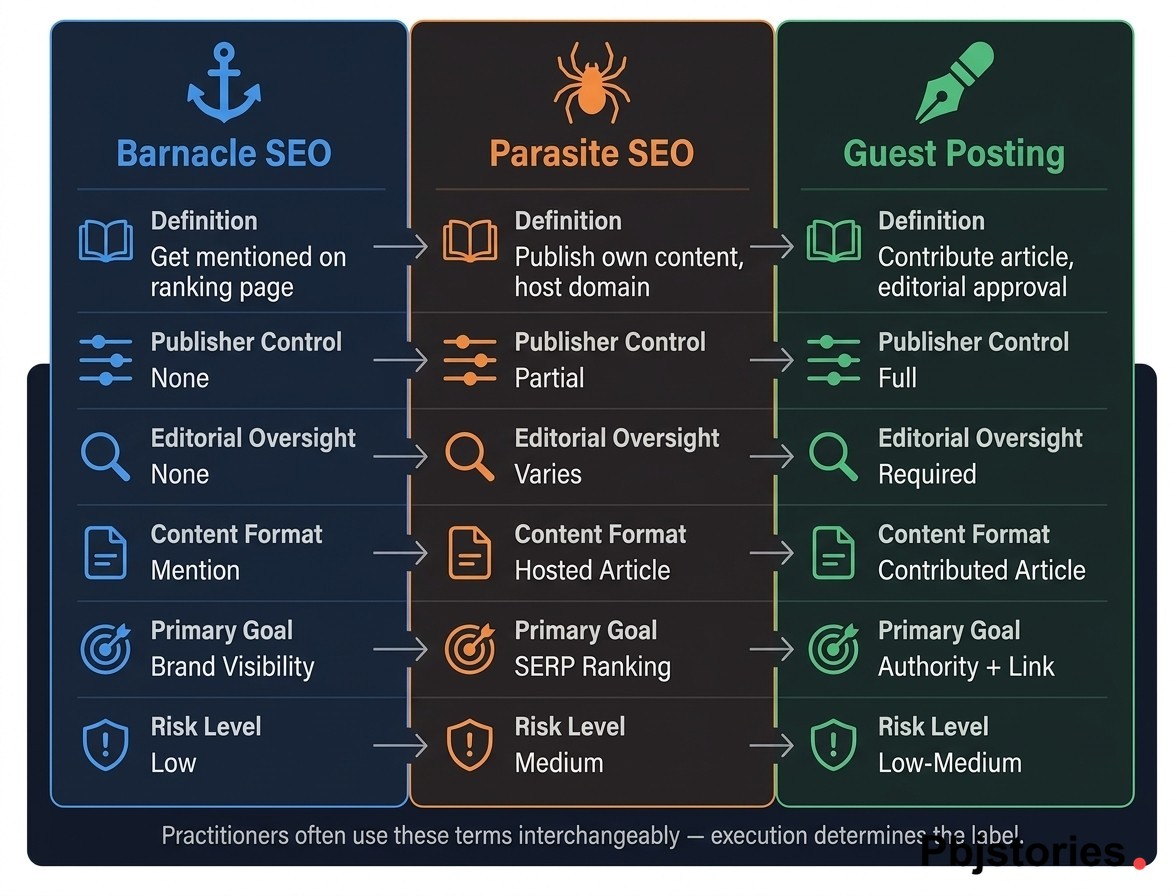 Practitioners use these labels inconsistently. One SEO's "barnacle strategy" is another's "parasite play," which causes confusion in job interviews, client pitches, and agency proposals. Before debating tactics, define whether the conversation is about mentions on ranking pages, hosted publishing, or editorial contributions. The mechanics, risks, and KPIs change with each.