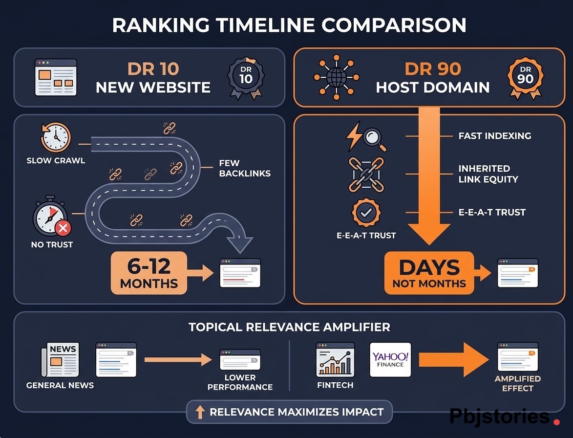 The causal chain is straightforward. High host authority leads to faster indexing, indexing on a trusted domain leads to inherited link equity, and inherited equity shortens the distance to the first SERP. Content that would struggle for months on a weak site can surface within days on a strong one.