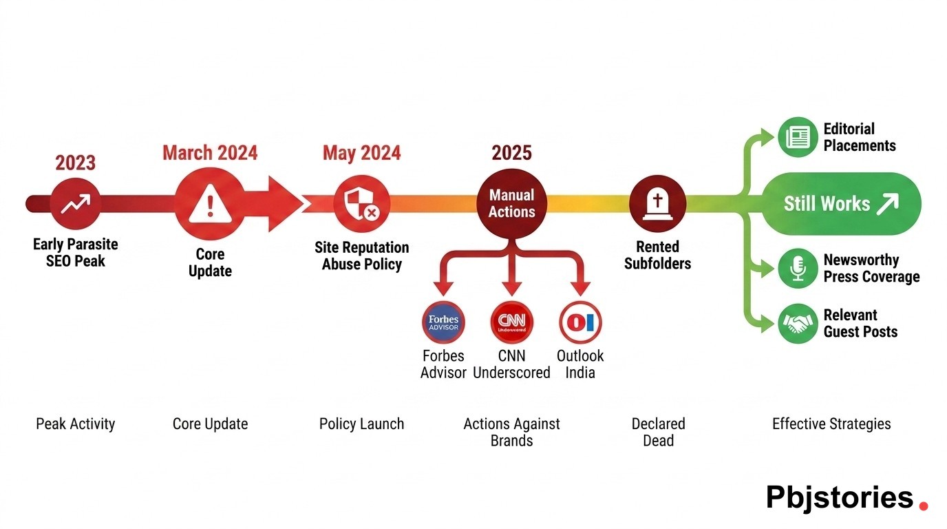 2025-2026, algorithmic enforcement: Google extended the policy algorithmically and began flagging AI-generated parasite content at scale. Surviving winners are editorial guest posts, genuine news coverage, and press releases tied to real announcements.