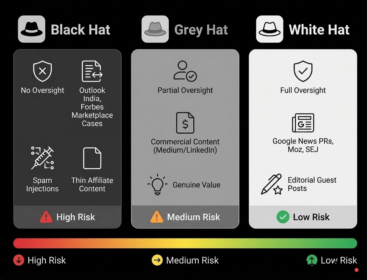 Black hat campaigns exploit host authority with thin affiliate content, as seen in the Outlook India and Forbes Marketplace cases. Grey hat sits in the middle: commercial content with genuine value on platforms like Medium or LinkedIn.